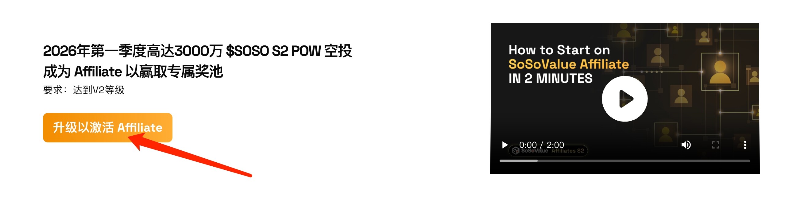 本周,SoSoValue 宣布开启第二季节点大使计划(Affiliate Program),第二季总奖池预计高达 3000 万枚 SOSO 代币, 并将于 2026 年第一季度进行空投。