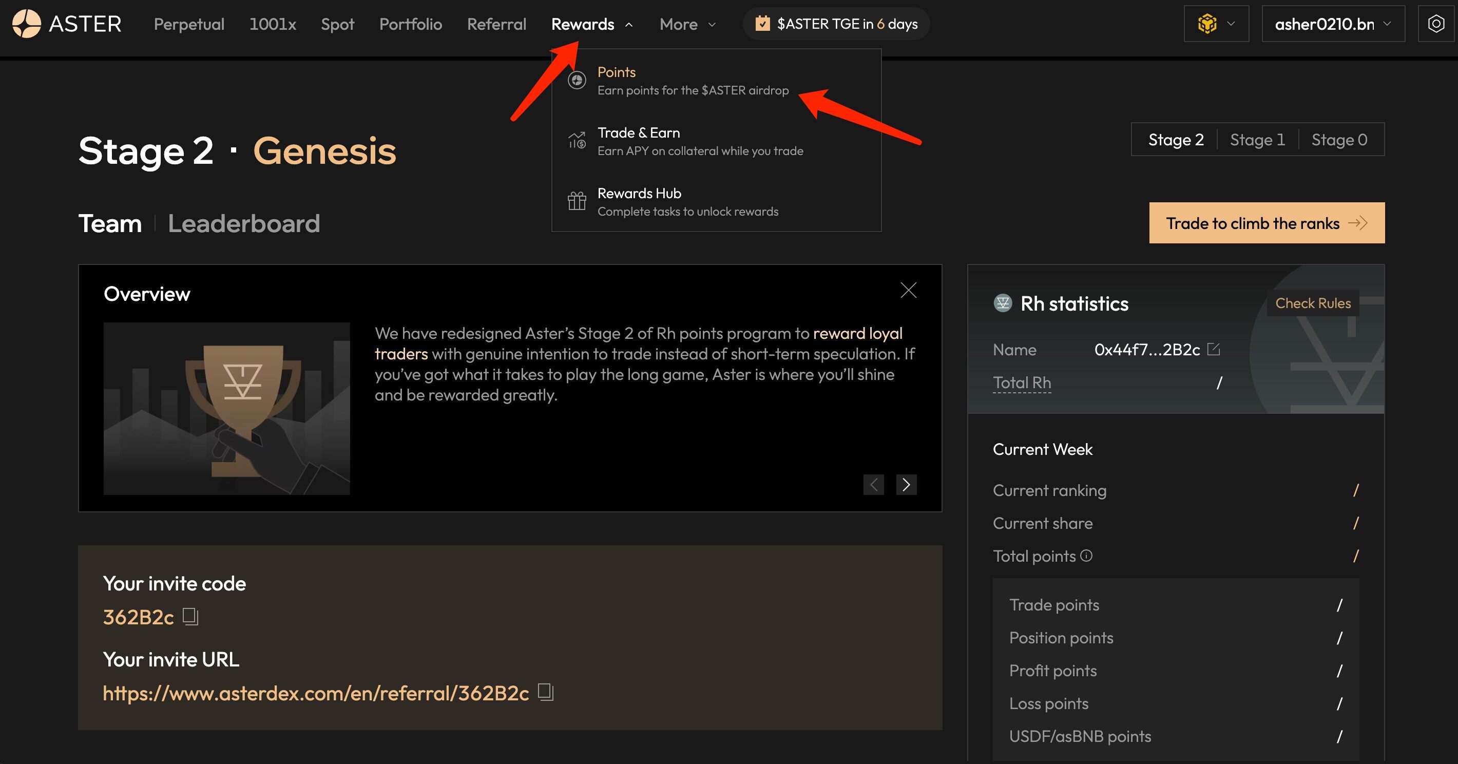 STEP 2. 点击“Rewards”后选择“Points”,可获得个人邀请链接,并查看账户的 Rh 积分数量。