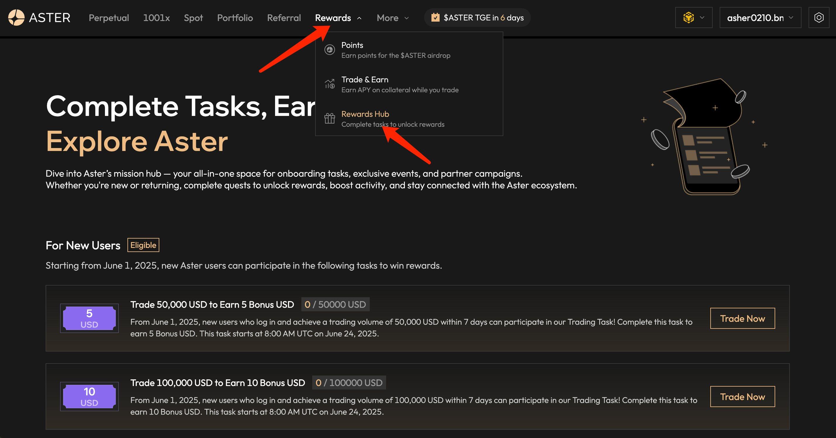 STEP 3. 点击“Rewards”后选择“Rewards Hub”,完成对应交易任务获得对应奖励。