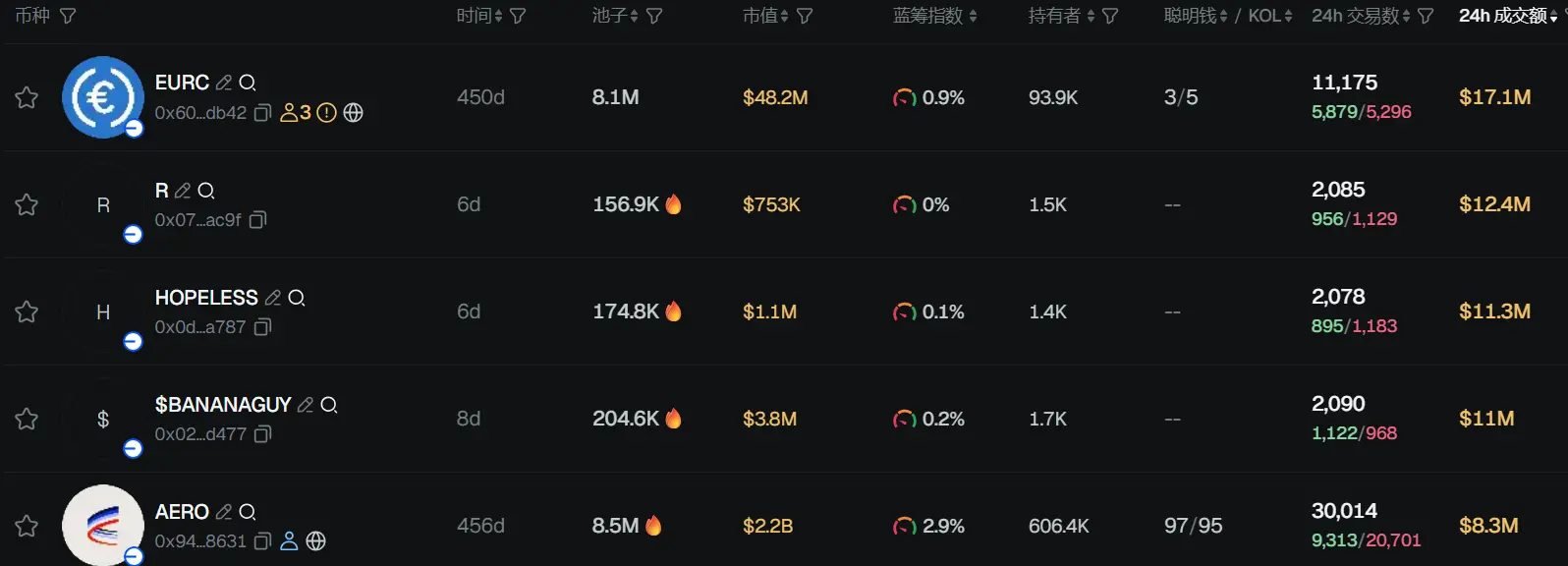 过去 24h Base 热门代币前五依次为:EURC、R、HOPELESS、$BANANAGUY、AERO