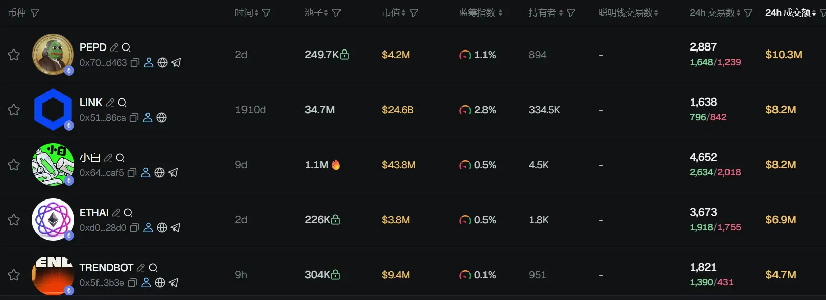 过去 24h ETH 热门代币前五依次为:PEPD、LINK、小白、ETHAL、TRENDBOT