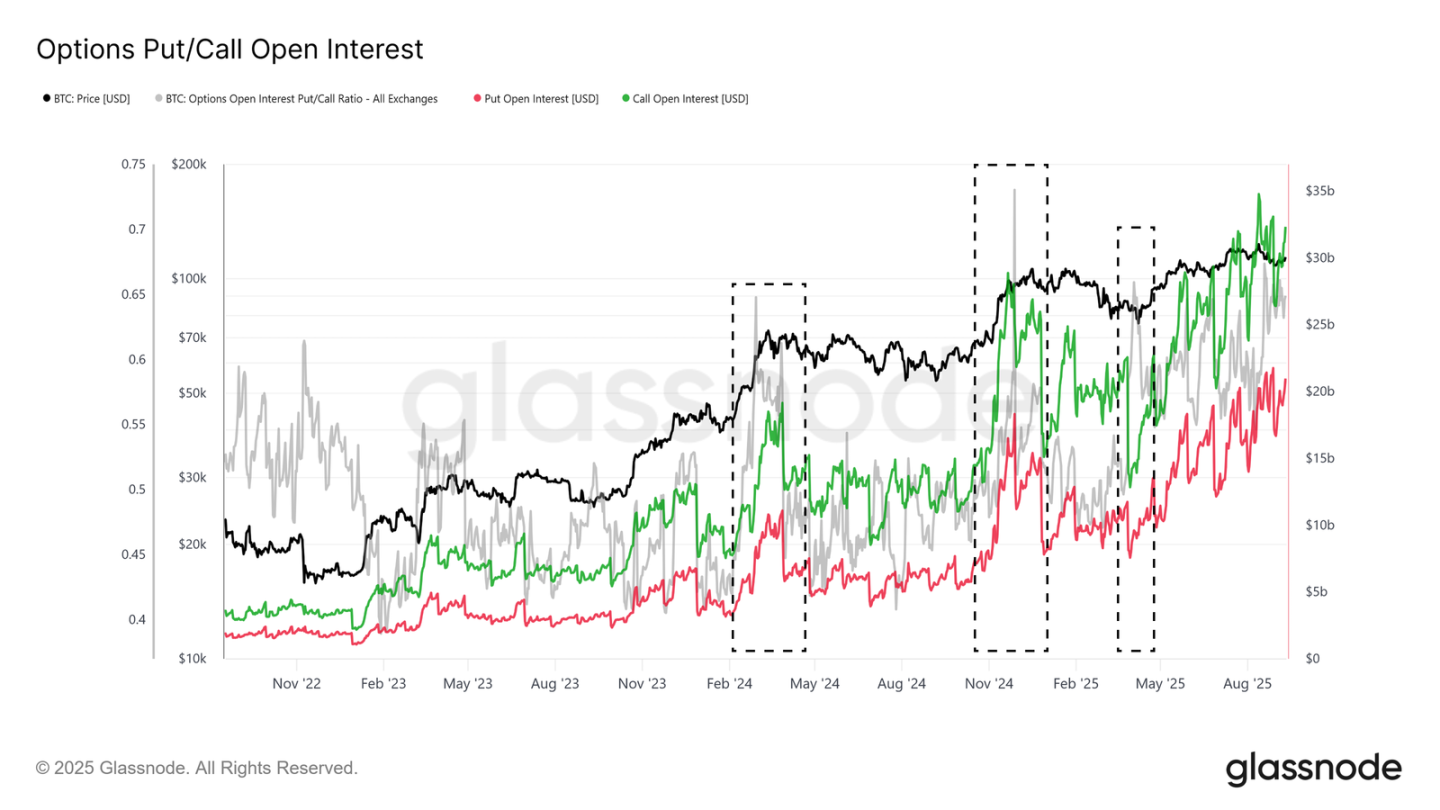 未平仓合约构成显示看涨期权明显多于看跌期权,尤其是在顶部形成阶段,突显了市场在仍管理下行风险的同时偏向看涨。总之这些动态表明市场结构更健康、更具风险管理特性,可能会抑制即将到来的狂热和看跌走势。