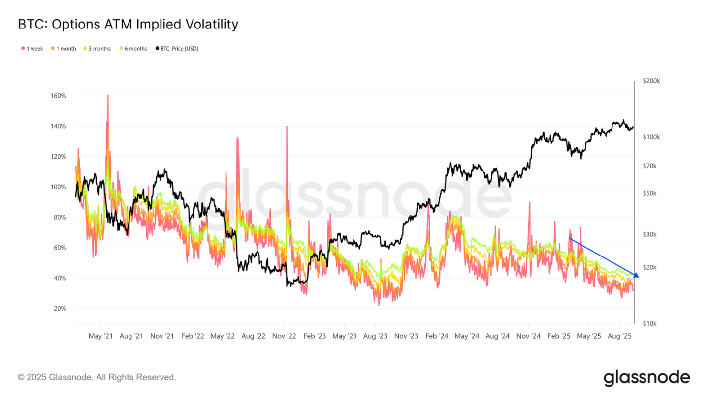 隐含波动率持续下降,这是市场更成熟、流动性更强的标志。波动率卖出(一种常见的传统金融策略)给隐含波动率水平带来了稳定的下行压力,导致与过去周期相比价格走势更加稳定。