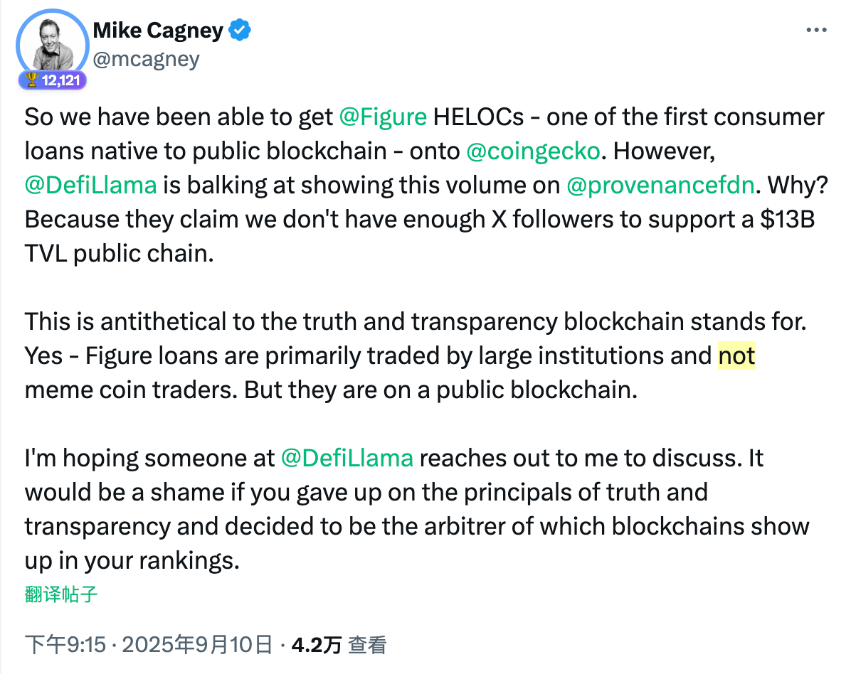 9 月 10 日,Figure 联合创始人 Mike Cagney 在 X 平台 率先开火 , 公开指责链上数据平台 DefiLlama 拒绝展示其 RWA TVL,仅因“社交平台粉丝数不足”,并质疑其“去中心化标准”的公允性。