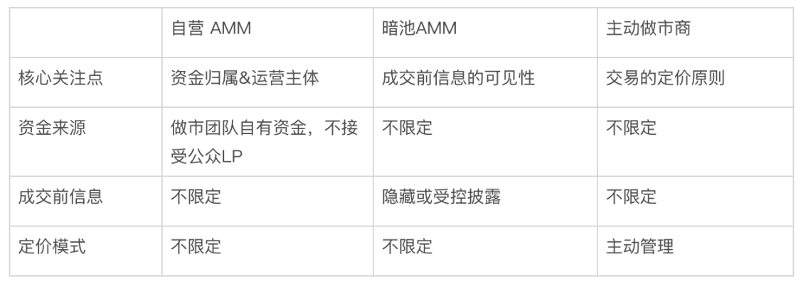 厘清定义后不难发现,这三个概念并非相互割裂排斥,而是描述同一金融实体的不同维度。事实上,一个典型的自营 AMM,为了追求极致效率和安全,其交易方式通常是「暗池」模式,其定价策略(虽不公𫔭)大概率也是「主动」的。