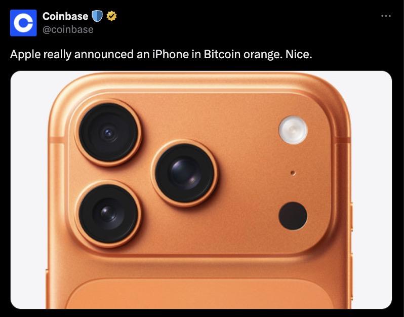 苹 果 (Apple) 最新、最顶级的 iPhone 17 Pro 终于问世,而对于比特币社群来说,全场焦点是其全新的「宇宙橘」配色。虽然这种颜色在 2025 年早已成为时尚伸展台和名人的主流选择,但在加密货币圈,它立即引发了不同的共鸣。橘色一直以来都与比特币有所关联,这可以追溯到早期的社群驱动标誌。Coinbase 在 X 上的一篇贴文中称其为「比特币橘」,让这种连结变得更加明显。