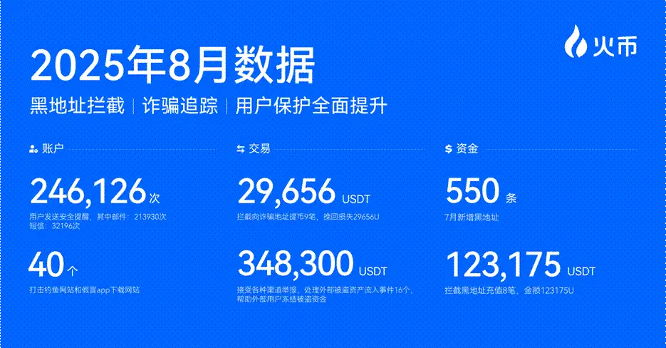 安全建设与资产储备方面,火币 HTX 8 月交出了一份可量化的数据成果:向用户发送 246,126 次安全提醒,有效预防潜在风险;打击钓鱼及假冒网站 40 个;成功拦截 9 笔向诈骗地址的提币,帮助用户挽回损失 29,656U 损失;处理外部被盗资产流入事件 16 起,冻结涉案资金 348,300U ;新增黑名单地址 550 条,拦截黑地址充值 8 笔,金额达 123,175U 。