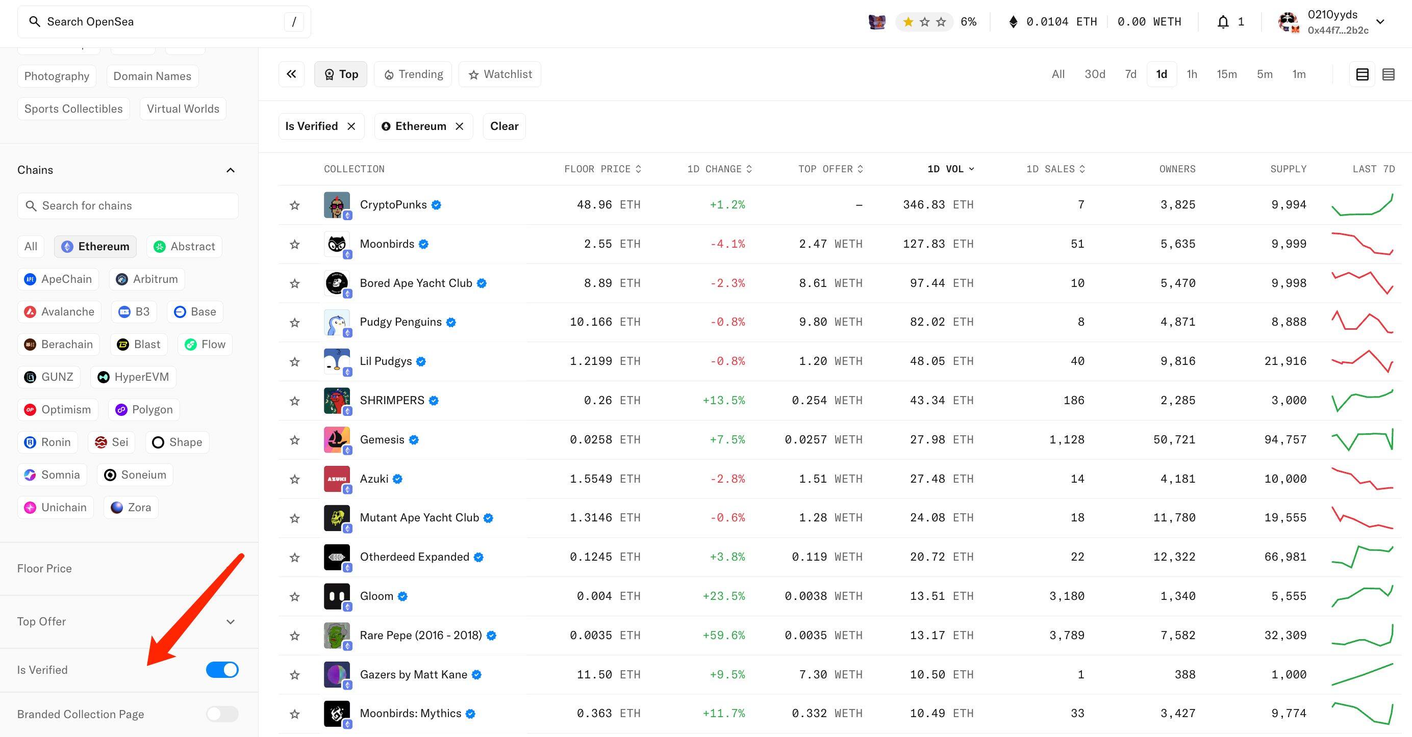 STEP 4. 第二个任务是在 ETH 网络购买平台认证过的 NFT 项目(NFT 价值最少 10 美元)。如下图所示,在认证选项处点击确认,挑选地板价超过 10 美元的 NFT 项目。