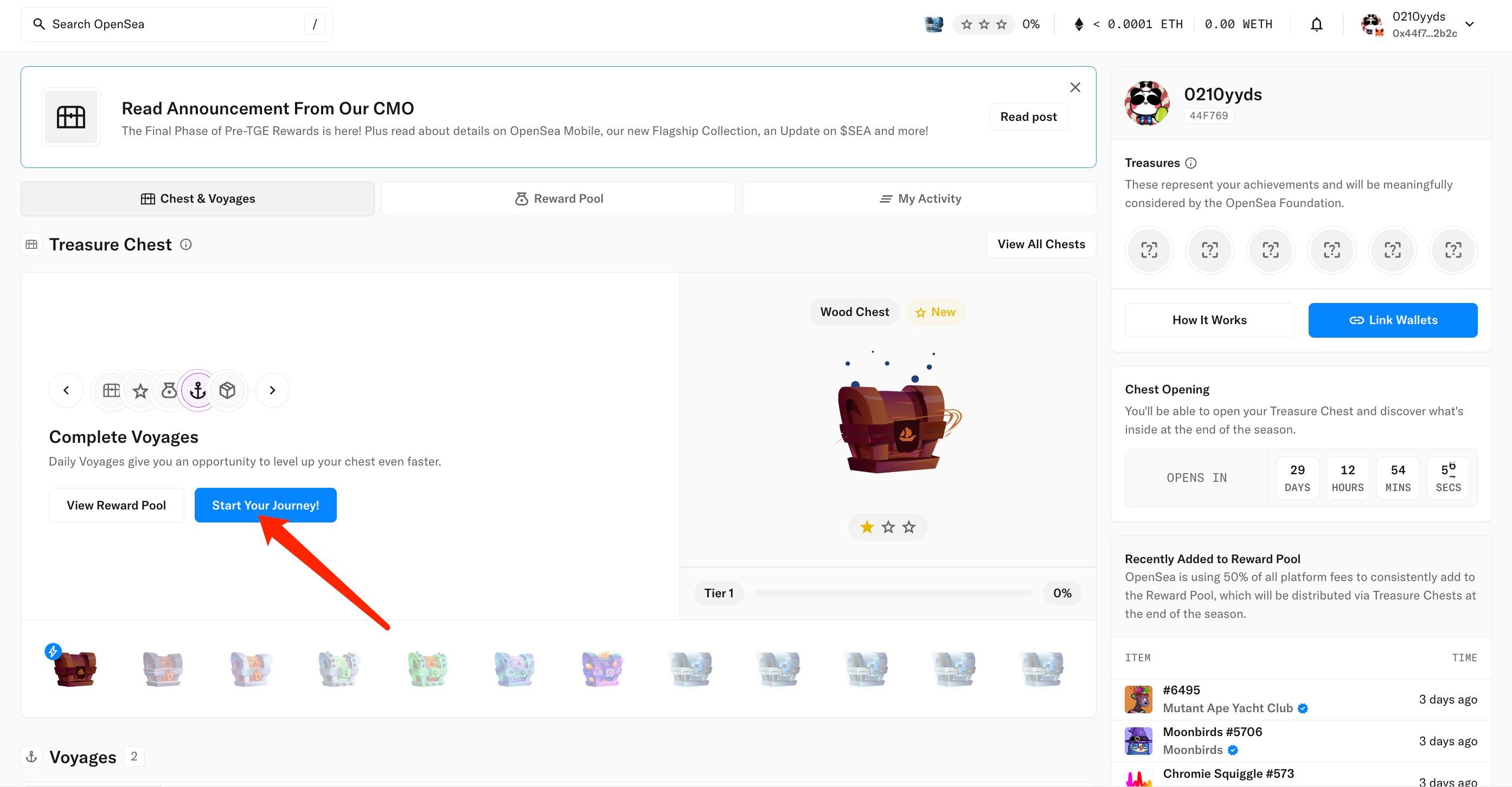 今日为 OpenSea TGE 前的最后奖励阶段任务的首日,全员任务进度清零,重新同一起跑线交互。下面,Odaily星球日报手把手带大家参与 OpenSea 发币前的最后奖励任务。