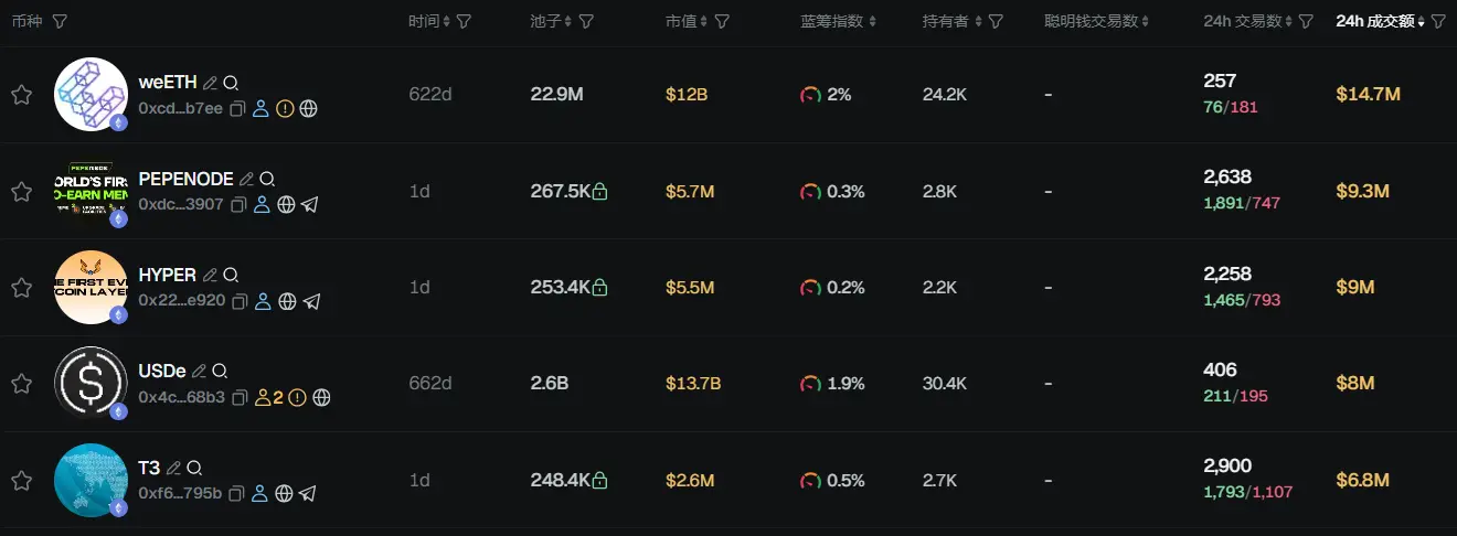 过去 24h ETH 热门代币前五依次为:weETH、PEPENODE、HYPER、USDe、T3