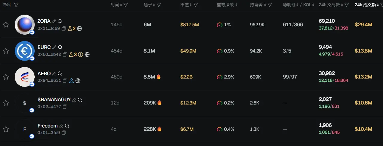 过去 24h Base 热门代币前五依次为:ZORA、EURC、AERO、$BANANAGUY、Freedom