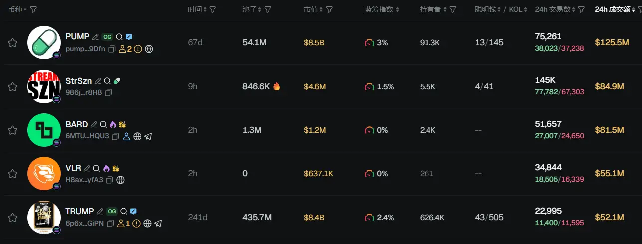 过去 24h Solana 热门代币前五依次为:PUMP、StrSzn、BARD、VLR、TRUMP