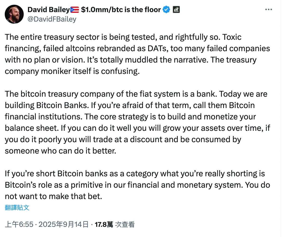 风险投资公司 Breed 对此则表示,只有少数比特币金库公司能经得起时间考验,避免陷入接近净资产价值交易的“死亡螺旋”。