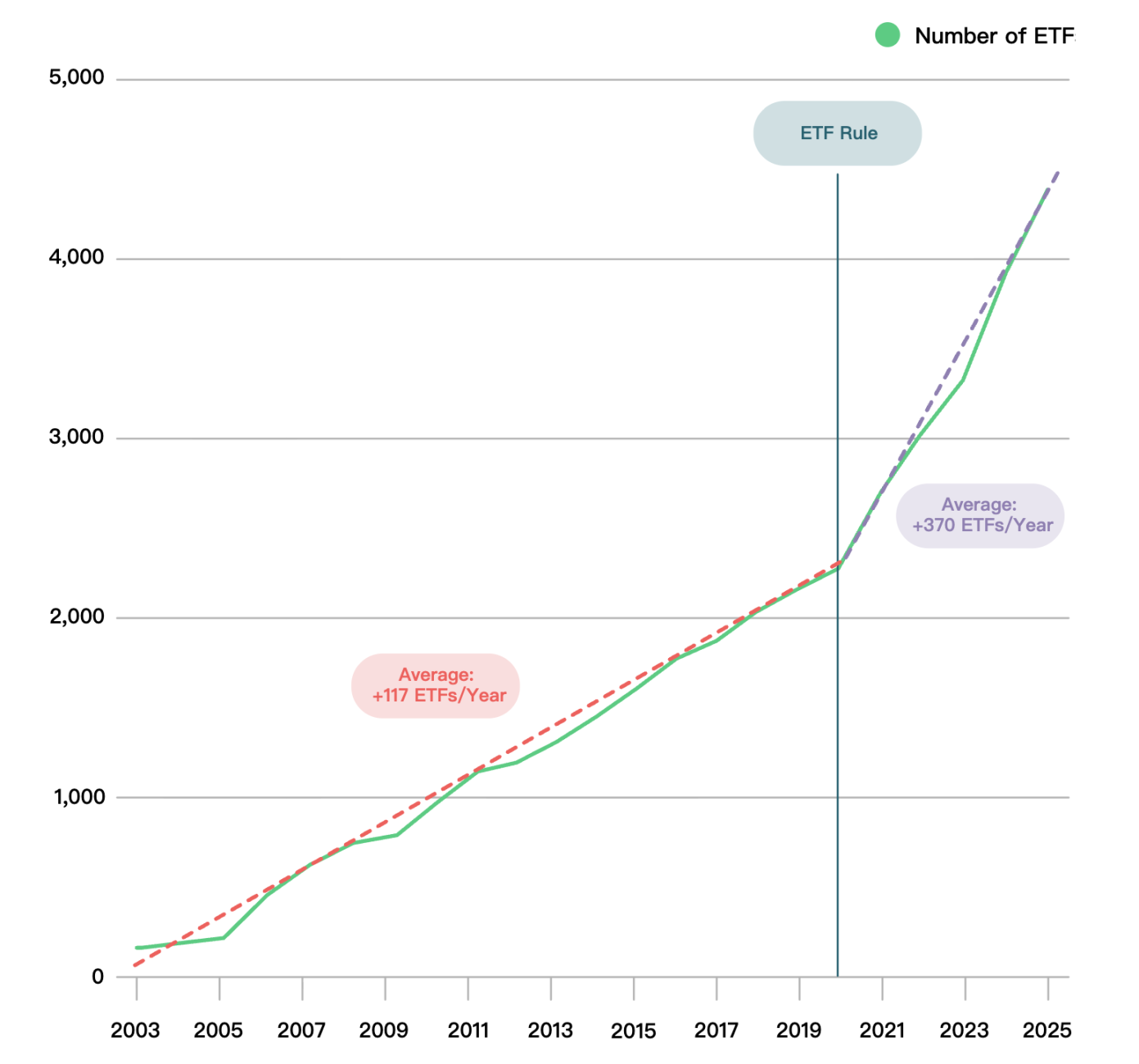 下面这张来自 ETFGI 的图表显示了美国每年上市的 ETF 数量。在 ETF 规则通过之前,每年平均有 117 只新的 ETF 进入市场。自 ETF 规则生效以来,这个数字增加了两倍多,达到每年 370 只。