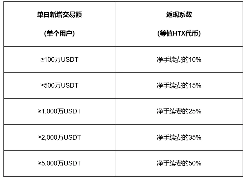 在9月18日现货交易额为2,000万USDT,则用户A当日新增交易额为1,200万USDT;根据返现规则,用户A在当日的返现系数为25%,则用户A在当日应获得【2,000万USDT的净手续费】*【25%】的等值HTX代币返现。