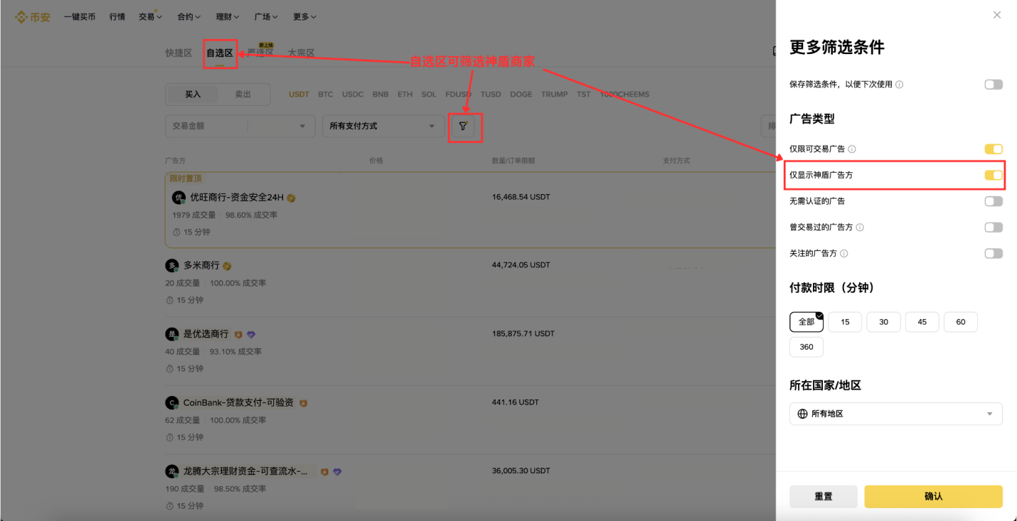 此外,为了方便用户选择,币安在C 2 C 界面单独开了严选区,如果用户想要直接跟严选区的商家进行交易,使用网页端或者新版的 app 可以直接点击严选区而不需要在商家列表中多一步筛选商家的步骤。即使用户在非严选区交易,也可以选择大宗区或者自选区通过筛选找到神盾商家。