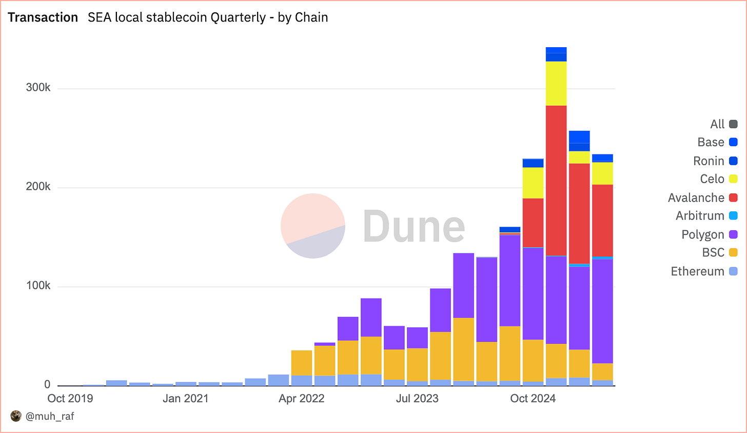 自 2020 年 1 月以来,东南亚地区非美元稳定币的采用率迅速上升,从最初的 2 个项目增长到 2025 年的 8 个项目。这一增长得益于交易量的增加以及多样化区块链平台的使用。