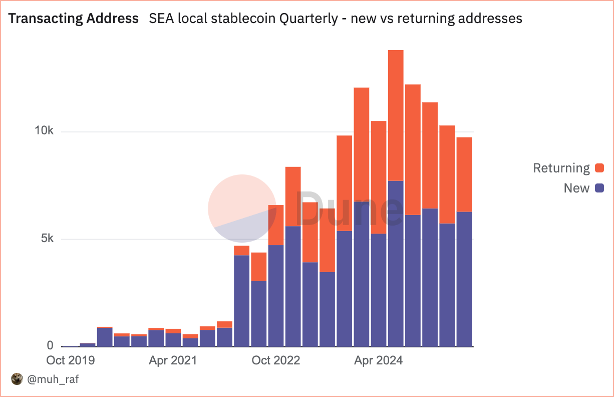 自 2025 年第二季度以来,东南亚的非美元稳定币得到了广泛的采用,活跃(交易)地址数量显著增加,超过 10,000 个,其中,4,558 个为回访地址,5,743 个为新增地址,显示出稳定币用户的稳步增长和参与度提升。