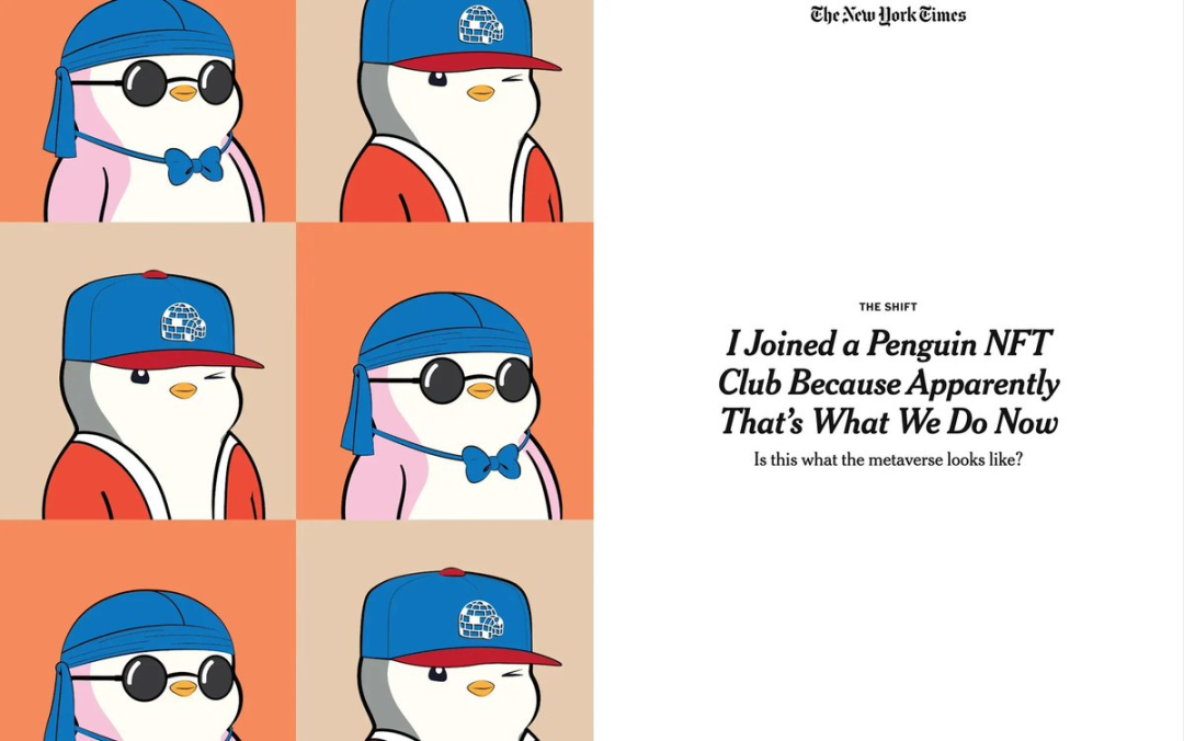 2021 年 7 月,由 Cole Villemain 等四名大学生创作的 NFT 系列「胖企鹅」正式推出,8888 个独特生成的胖企鹅 NFT 以每个 0.03 ETH 的价格,19 分钟内售罄,吸引名人购买并获《纽约时报》等主流媒体关注。