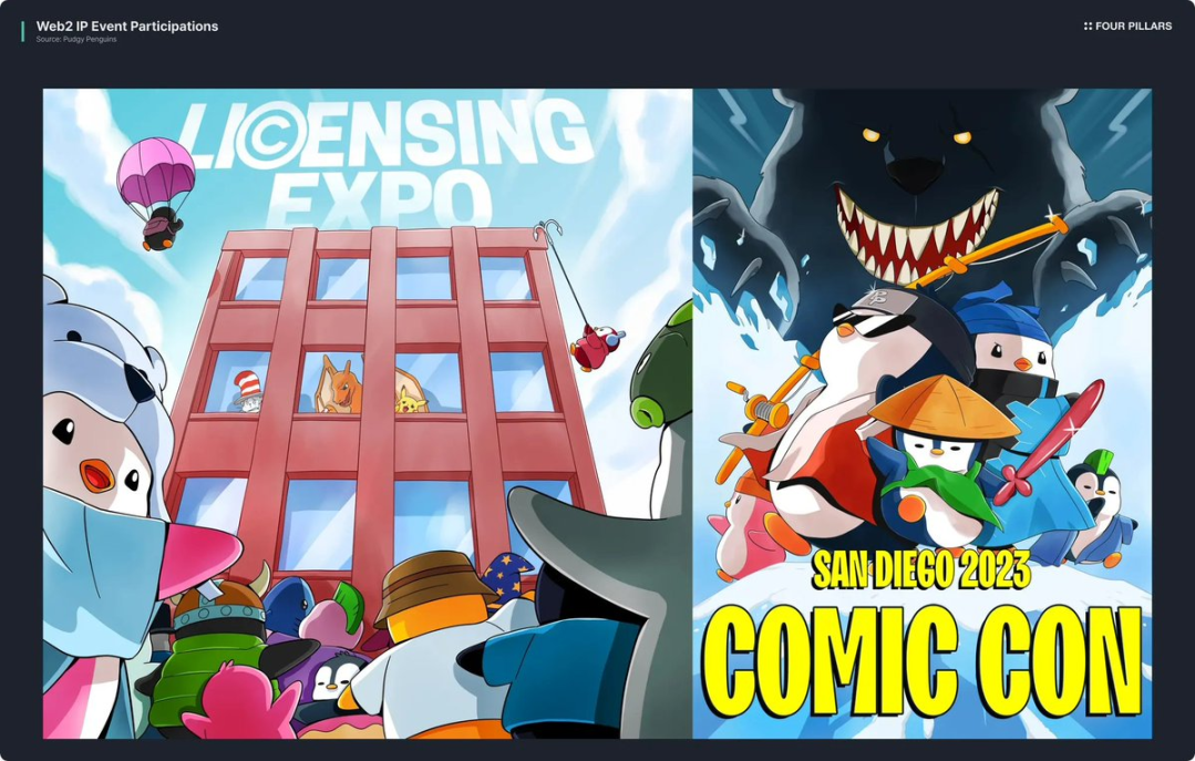 - 2023 年 6 月,亮相拉斯维加斯「2023 授权博览会」(Licensing Expo 2023)—— 该展会是全球最大授权行业展会,迪士尼、宝可梦等顶级 IP 均参会,胖企鹅首次将 NFT IP 作为可授权内容,与 Web 2 企业建立联系。