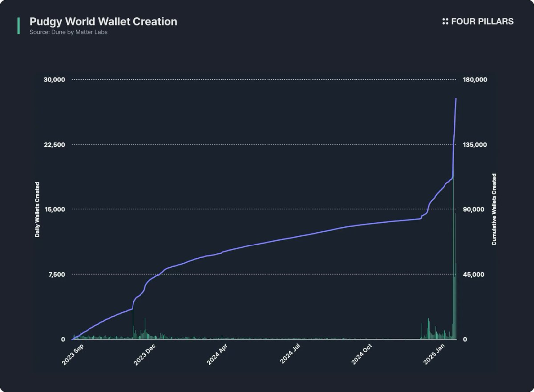 值得注意的是,空投总量中约 24% 分配给与胖企鹅无直接关联的链上生态贡献者,包括以太坊与 Solana 的活跃链上用户、主流 NFT 项目持有者及广泛加密社区,最终超 600 万个钱包获得 PENGU 申领资格,社区规模实现突破性扩张。