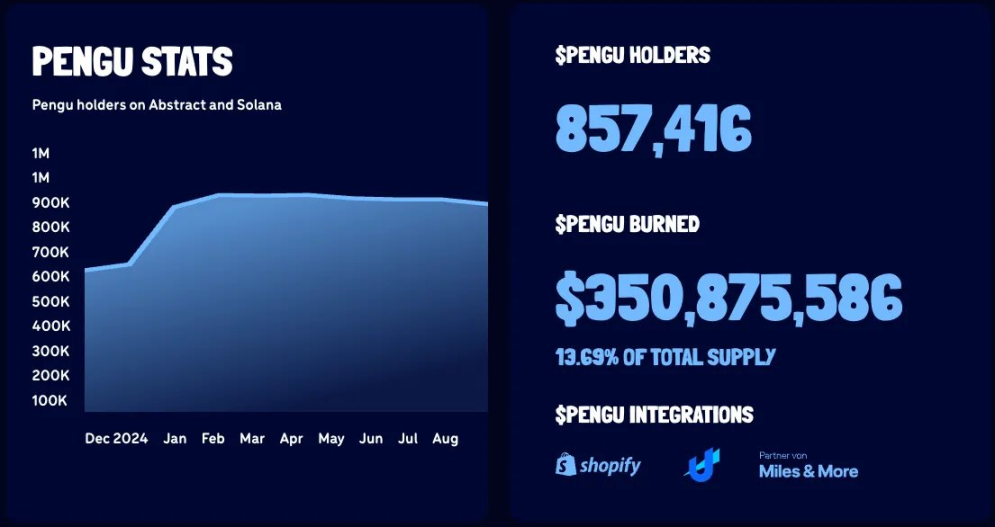 2024 年 12 月 17 日 PENGU 正式上线后,市场反应强烈:初始市值 25 亿美元,峰值达 35 亿美元;一周内链上持有者超 50 万人;上线一个月内,成为仅次于 DOGE、SHIB、PEPE 的全球第四大模因币,也是过去三年发行的模因币中市值最高的。