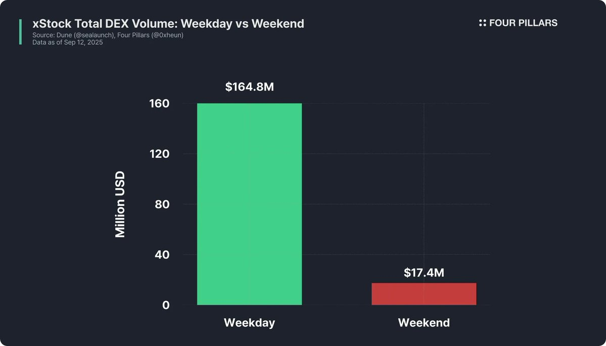 数据显示,周末链上股票交易量降至工作日水平的 30%或更低。与全天候无缝交易的加密原生资产不同,代币化股票仍然继承了传统市场交易时间的行为惯性。当参考市场(如纳斯达克、纽约证券交易所)休市时,交易者似乎不太愿意进行交易,这可能是由于套利、价格缺口以及无法在链下对冲头寸的担忧。