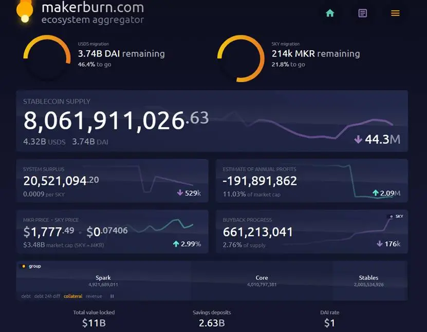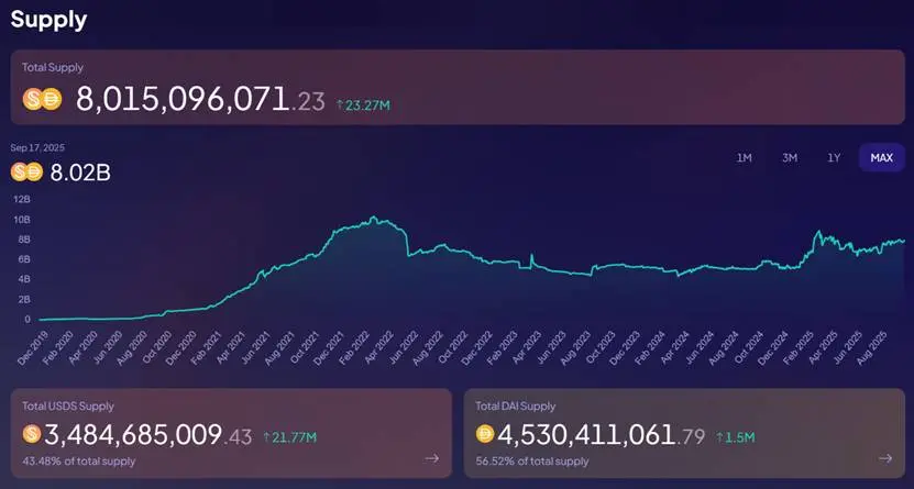 本次品牌与治理重构,是把治理从 MKR 迁至 SKY ( 1 MKR = 24,000 SKY ),将稳定币从 DAI 升级到 USDS ,并把数据与入口统一到 sky.money 。升级的用户将能够受益于核心新功能,例如原生代币奖励,持有 USDS 稳定币的用户可以获得 SKY 治理代币奖励,可通过项目的新应用程序 sky.money 获得。