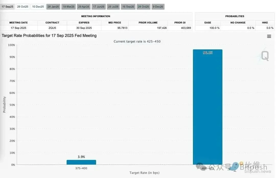 市场几乎一致预期,在为期两天的政策会议结束后,Fed 将在周三宣布九个月来的首次降息。根据 CME 的 FedWatch 工具,降息 25 个基点至 4.25%−4.50% 区间的概率高达 96%,几乎是板上钉钉的事实。