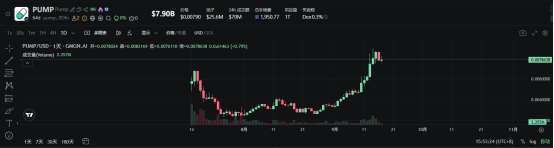 从回购数据来看,截至9月17日,自 7 月 15 日开始回购 PUMP 以来,已累计回购价值约 1.008 亿美元 PUMP代币,已使总流通供应量减少 6.794%。从9月3日开始,PUMP价格迅速走高,从0.004美元最高飙升至.0089美元,现回落至0.0079美元,相比上线时的高点再度上涨16.17%。