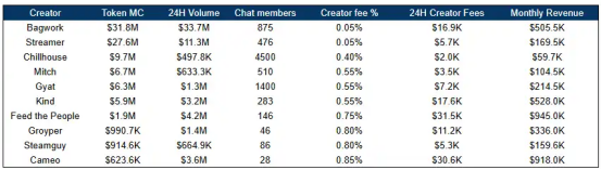 在 Pump.Fun 的交易分成下,主播达成同一收入的门槛迅速降低。仅9月15日, Pump.Fun 救支付了超过 400 万美元的创作者奖励。其中,有9,000个钱包领取了 280 万美元的创作者费用。这意味着平均每位创作者每日可获得约300美元的报酬,若模式持续,每月可获得约9000美元的报酬。而在Twitch上,达成6位数的收益至少需要每场1万以上的在线人数,在Pump,数千甚至几百人就可实现,例如市值仅62万美元的代币Cameo,聊天室仅仅28人,24小时创作者收入就可达到3万美元。