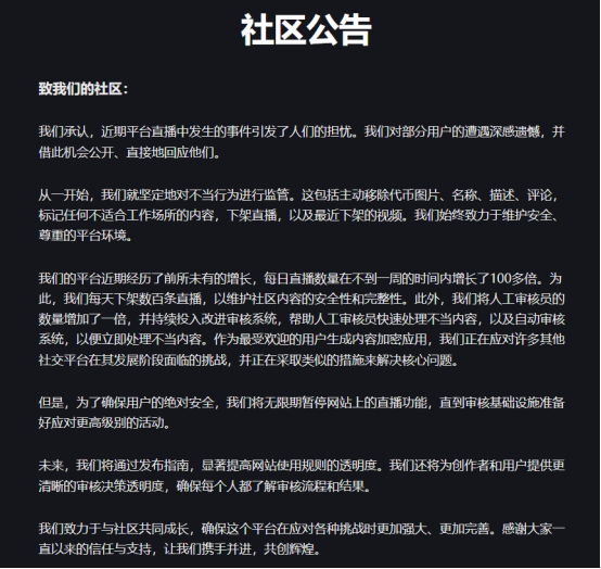 从效果而言,在直播刚刚上线时,并未如预想般给Pump.Fun带来水花,但在去年11月官方大力推广后,突然掀起了一波直播热潮,在当年的11月份,网站的每日收入几乎翻了五倍,达到 500 万美元。但可怕的是,Pump.Fun的直播内容审核机制完全缺失,而为追求流量与注意力,直播间的内容愈发出格,不惜作出各式极端行为,直播虐待动物、凶杀、自杀乱象频出,一度使直播间成为了群魔乱舞的代名词,堪称黄暴游乐场。在此背景下,2024年11月26日,Pump.fun宣布禁用直播功能,协议收入也迅速下降33%至360万美元。