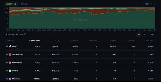 9月的直播适时的挽救了这一颓势。在直播热潮带动下, Pump.Fun 数据直线飙升。9月14日, Pump.Fun 创始人alon发文披露,“pump.fun 已经在平均在线直播数上反超 Rumble。目前正逐步逼近Twitch市场份额的约 1%以及 Kick市场份额的约 10%。”9 月15日,据 Defillama 数据, Pump.Fun 过去 24 小时收入达 312万美元,超越 Hyperliquid 过去 24小时的248万美元收入。单周收入达1640万美元,创7 个月以来新高。市场份额也再度领先,据Jupiter数据,近 24 小时 Solana 发币平台市场份额排名中, Pump.Fun 从8月的60%左右飙升至9月17日的85%,其间一度以90.6%的份额碾压其他平台。日代币生成数量也迅速抬头,从不足4000重回3.4万,毕业率也有所提升,回到1.11%,创下近7个月的来的最大值。