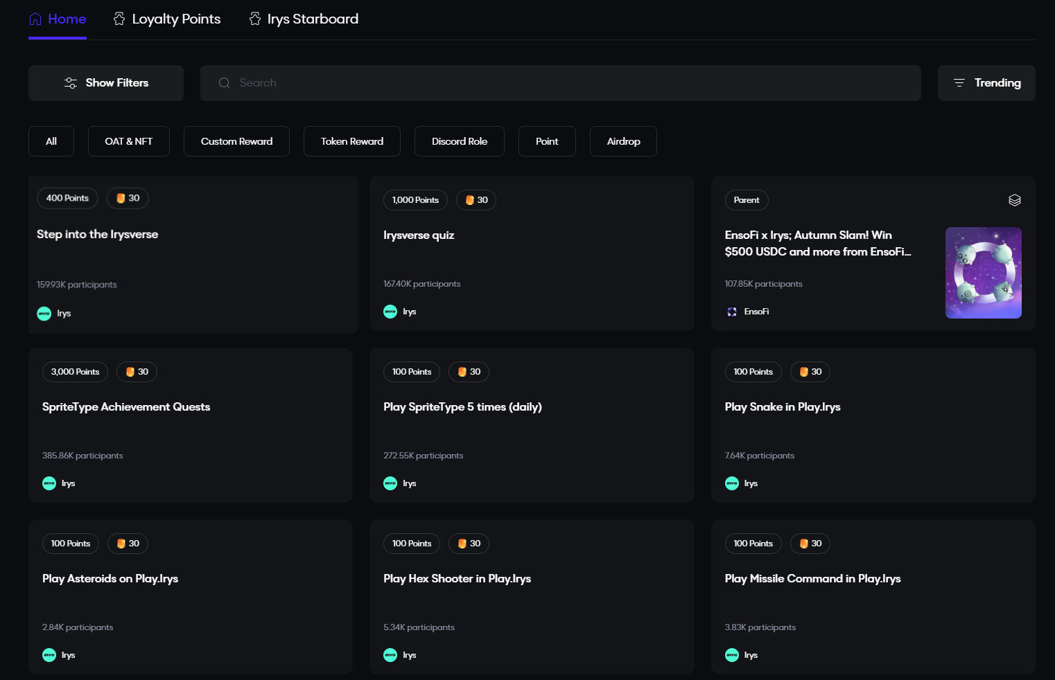 每日任务类有 Play Snake in Play.Irys,在贪吃蛇游戏中达到 advanced 等级,可以获得 100 积分;Play Asteroids on Play.Irys,在 Asteroids 游戏中达到 advanced 等级;Play Hex Shooter in Play.Irys,在 Hex Shooter 游戏中达到 advanced 等级。