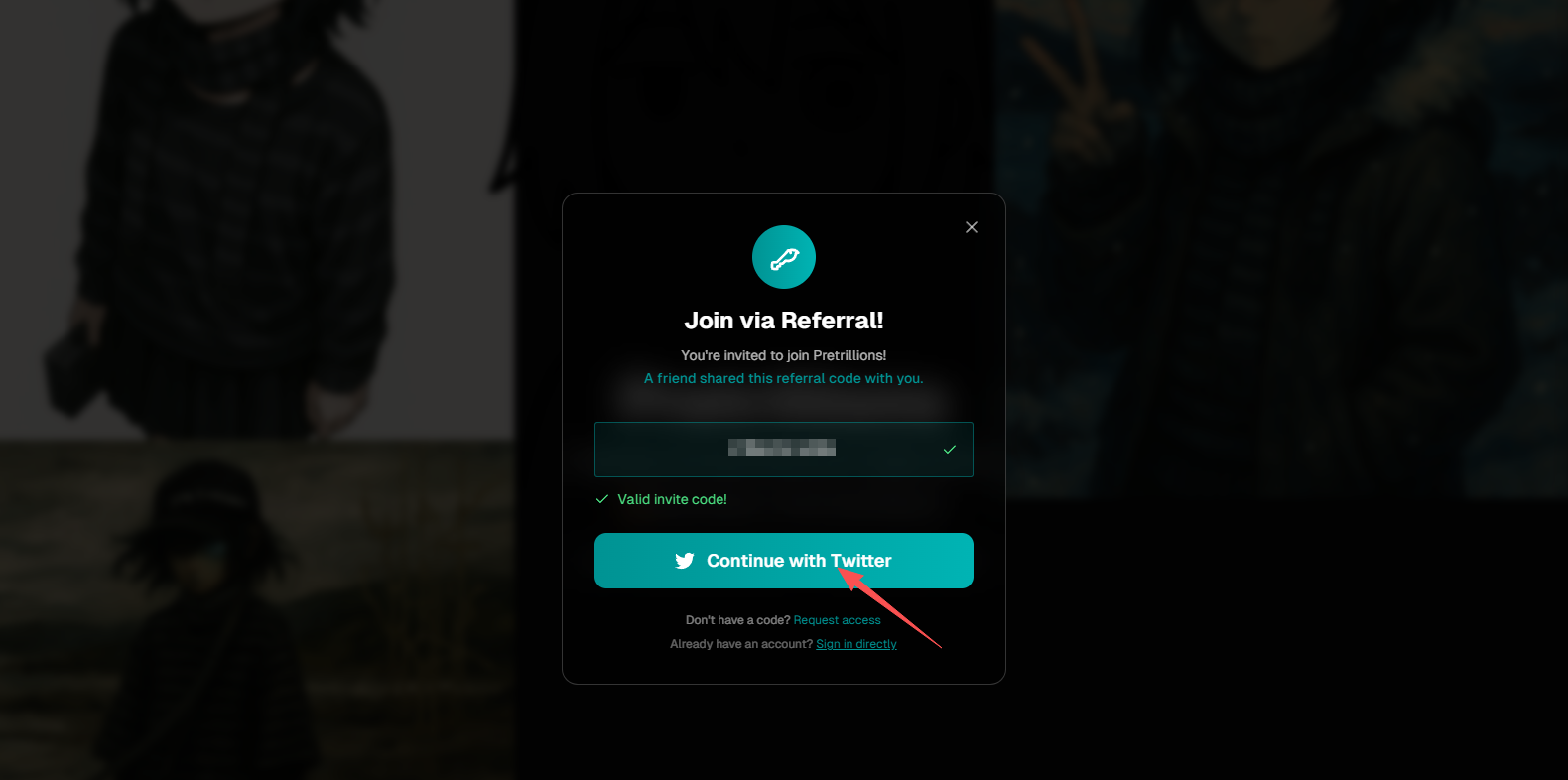 STEP 1. 进入交互网站(链接: https://www.pretrillions.com/ ),输入邀请码(需要邀请码才能进入)后,绑定 X 账号。