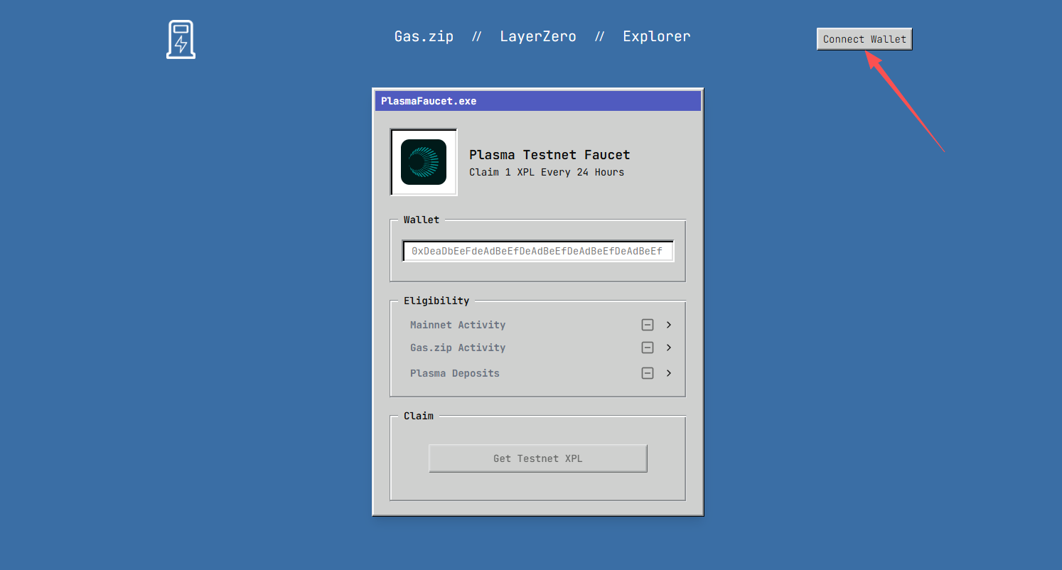 STEP 2. 领取测试代币(链接: https://www.gas.zip/faucet/plasma ),连接钱包,满足条件即可领取。