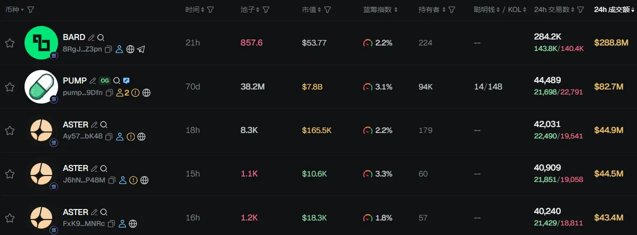 过去 24h Solana 热门代币前五依次为:BARD、PUMP、ASTER、ASTER、ASTER