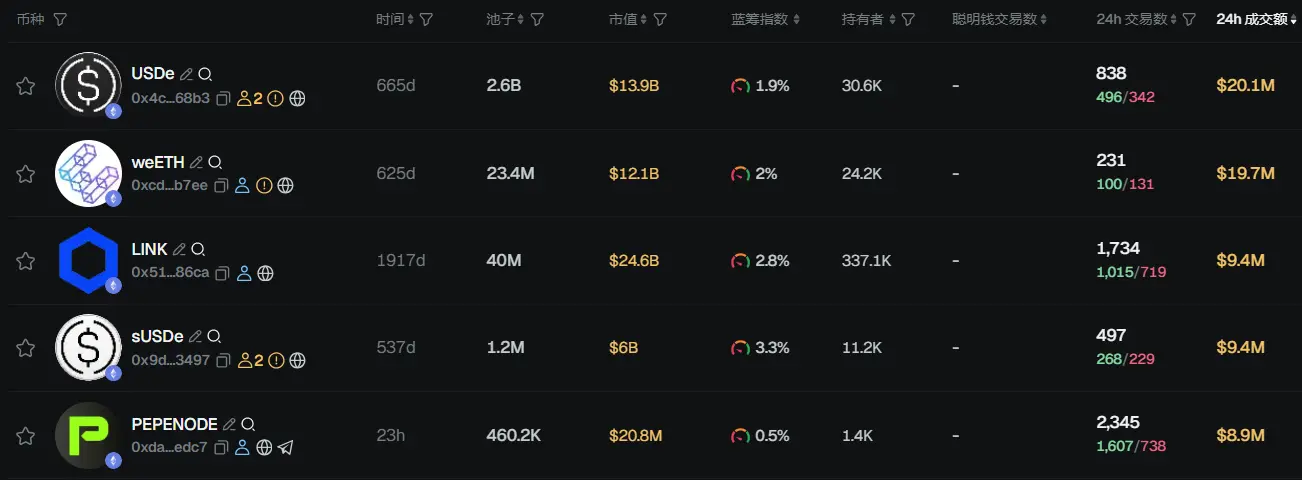 过去 24h ETH 热门代币前五依次为:USDe、weETH、LINK、sUSDe、PEPENODE