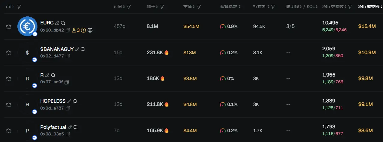 过去 24h Base 热门代币前五依次为:EURC、$BANANAGUY、R、HOPELESS、Polyfactual
