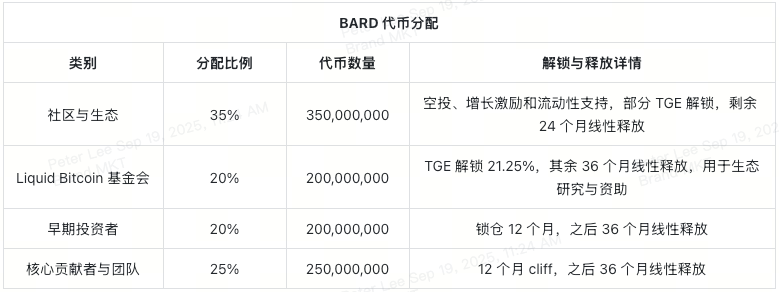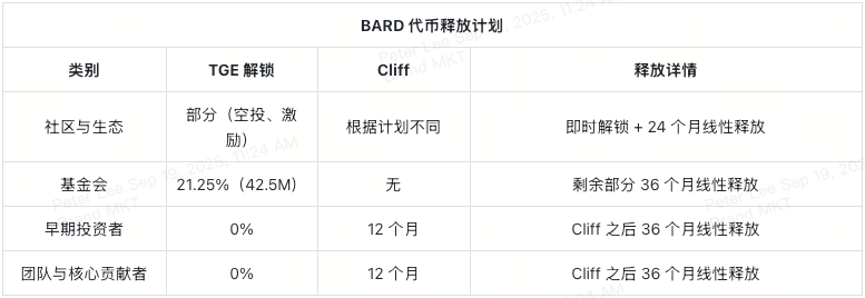 BARD 代币 总量固定为 10 亿枚。 在 TGE(代币生成事件)时,一部分代币已进入流通,其余部分按照多年线性解锁计划逐步释放,以确保长期利益相关方之间的平衡。这种设计既保障了社区的早期参与,又通过分期释放来对齐团队和投资人的激励。