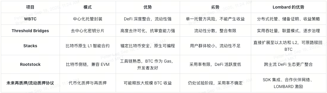 在把 比特币 引入 DeFi 的探索中, Lombard Finance 面临着多种不同模式的竞争。每种方案在托管方式、去中心化程度、流动性和可用性上都有各自的取舍。