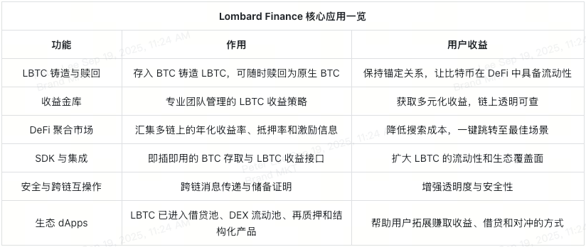 开发者可使用 Lombard 提供的软件开发工具包(SDK),轻松实现 BTC 存取、LBTC 铸造与收益整合。普通用户可以通过 Web 应用操作,包括一键铸造和赎回、由专业团队管理的收益金库,以及聚合的市场工具,帮助发现最佳收益和抵押机会。机构用户还能享受到合规与报表支持。