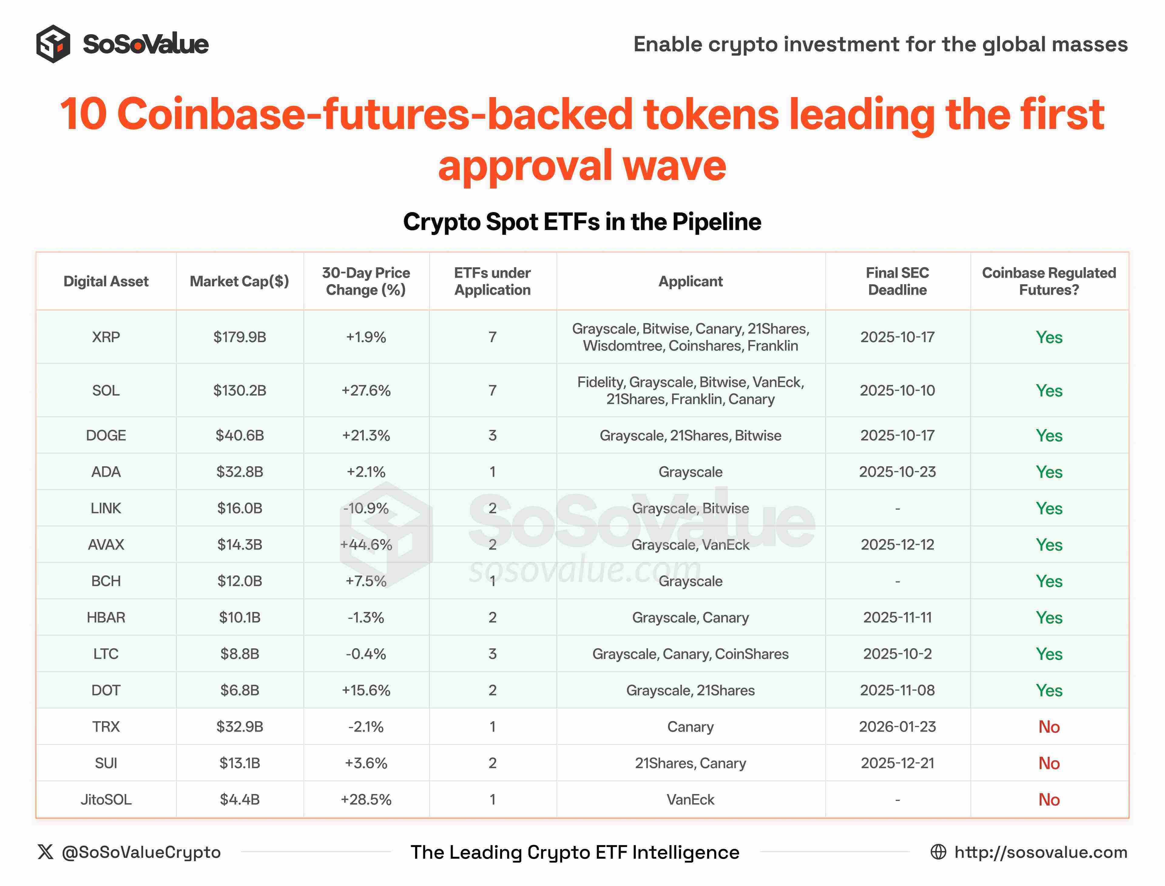 图 3:已有期货合约&提交 ETF 申请的 10 个主流币将率先迎来 ETF 落地(数据来源:SoSoValue)