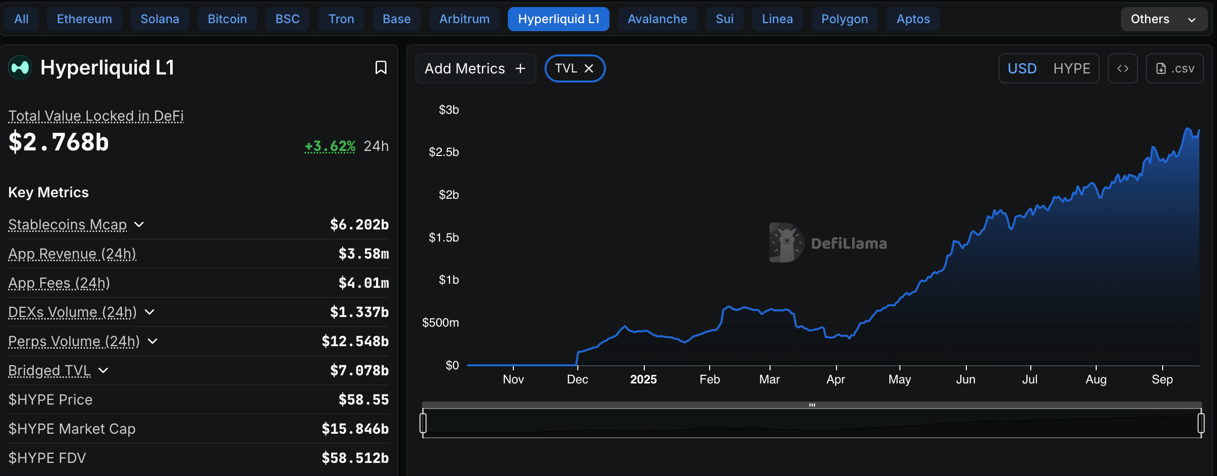 其总锁定价值(TVL)也远高于竞品:截至 2025 年 9 月,平台 TVL 约 27 亿美元。这种庞大资金体量和深度,使 Hyperliquid 的合约市场在多数币种上都具备接近币安的交易深度和稳定的资金费率。