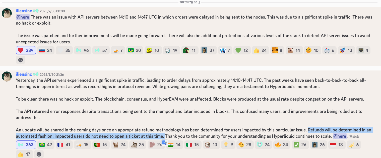 此外,Hyperliquid 与社区连接紧密,响应迅速。例如在 2025 年 7 月一次 API 故障导致短暂宕机后,团队迅速补偿用户约 200 万美元损失,展现出“快速响应、承担责任”的作风。用户感受很好,社区一片好评。