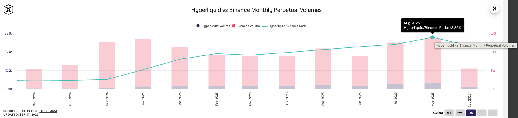 作为龙头,Hyperliquid 拥有极深的流动性和交易量。其每日成交额常达数十亿美元量级,2025 年 7 月单月永续交易量高达约 3190 亿美元,这推动当月全链永续交易量创新高(4870 亿),Hyperliquid 一家占比约 65%。在 2025 年中,Hyperliquid 的市场份额一度稳定在**75–80%**之间,远超其他竞争对手。2025 年 8 月单月永续交易量占币安合约的 13.85%,历史最高比例。 (The Block 数据)