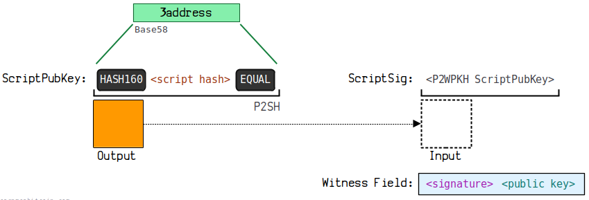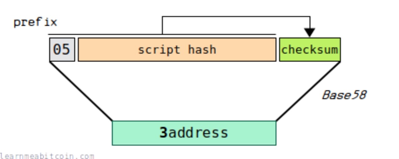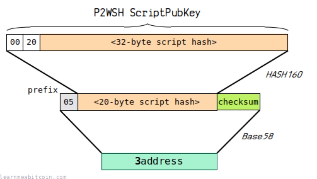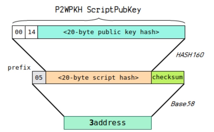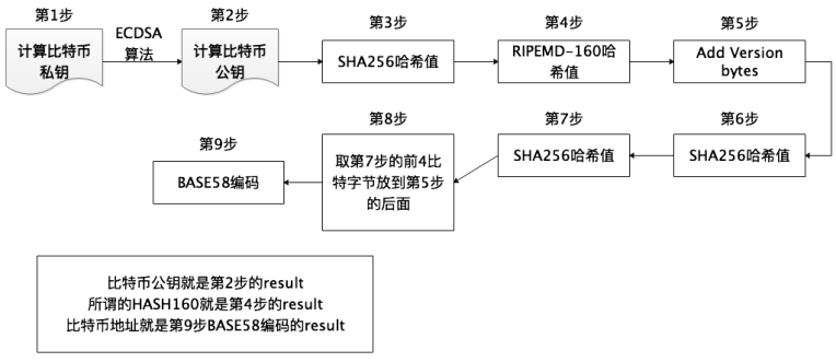 演示图中是最常见的地址算法生成原理图,后面还有一些不同的比特币地址类型,在原理图中会有一些差异,会在后面的第三节中详细讲解每种地址类型。