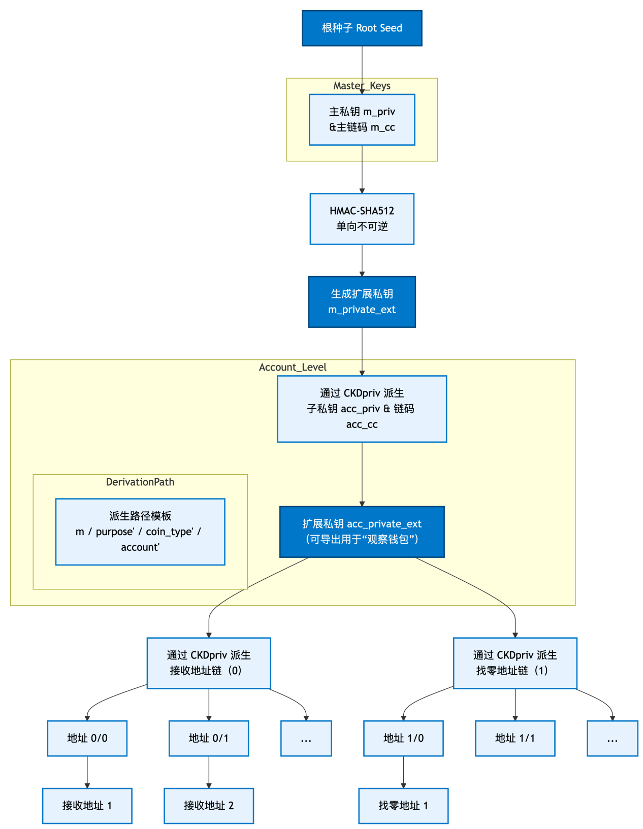 链式结构:HD 钱包从一个种子(助记词)可以生成近乎无限个地址和私钥。