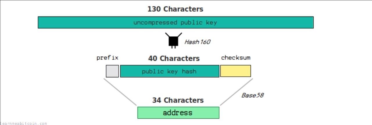 推导出私钥后,就能够得到私钥对应的公钥。然后根据算法计算钱包的地址。我们以最常见的比特币地址生成的过程演示如下: