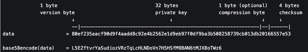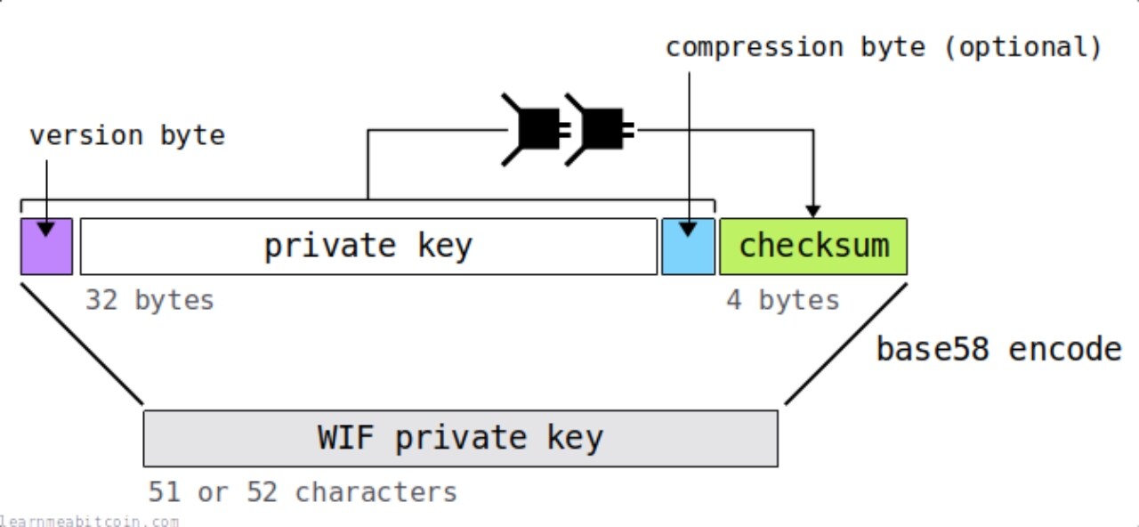 在与数字货币相关的公私钥知识中,还有一个常见名词 WIF(Wallet Import)Private Key,其编码格式 Encoding 示意图如下:Format